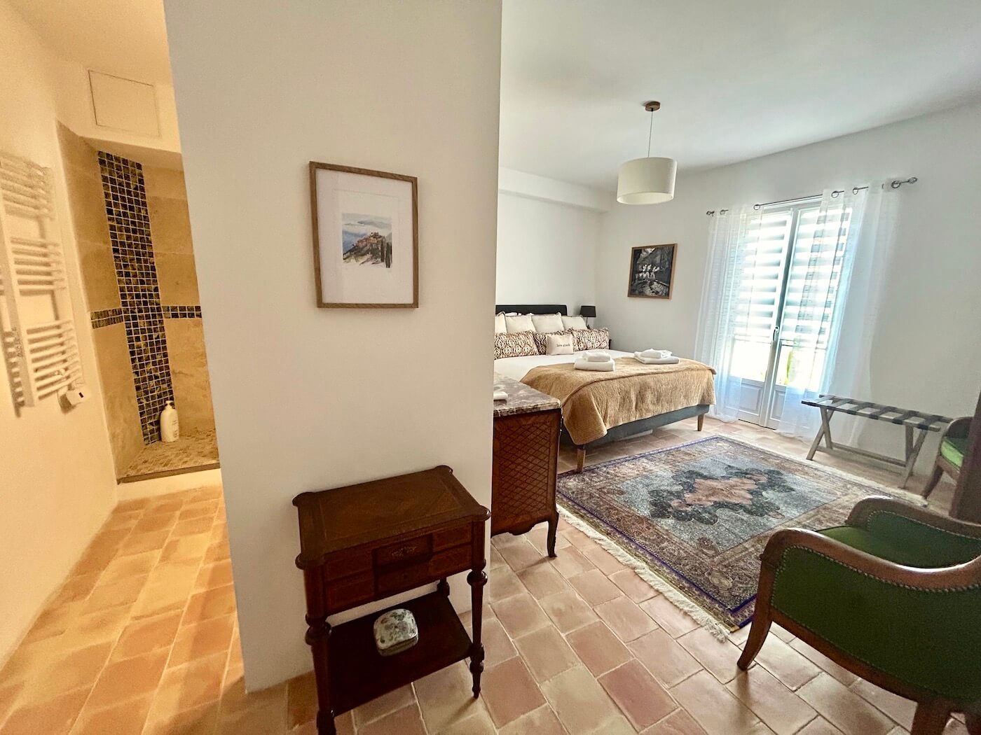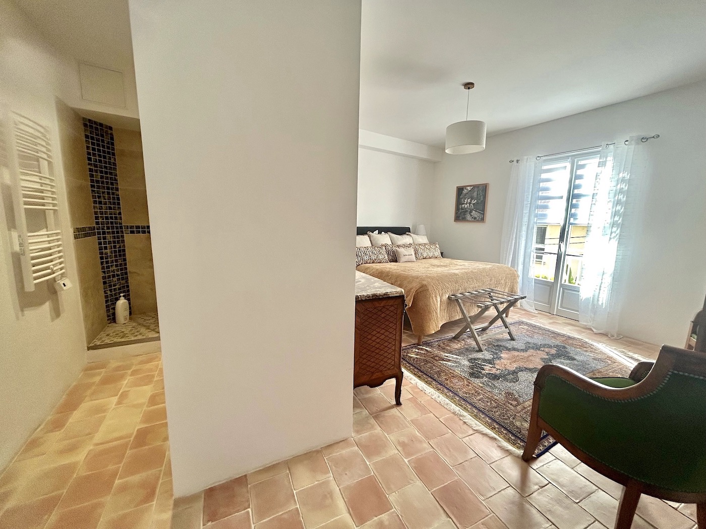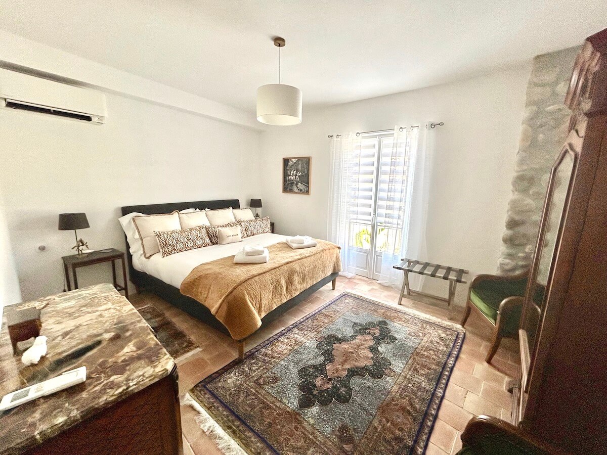 The last bedroom is the main bedroom with French doors that open over the garden. The bed is 190cm, there is a stone wall detail and ensuite bathroom in beige and white with walk-in shower, w.c and wash hand basin. The bedroom has 2 comfy armchairs, an armoire, chest of drawers and bedside tables with lamps.