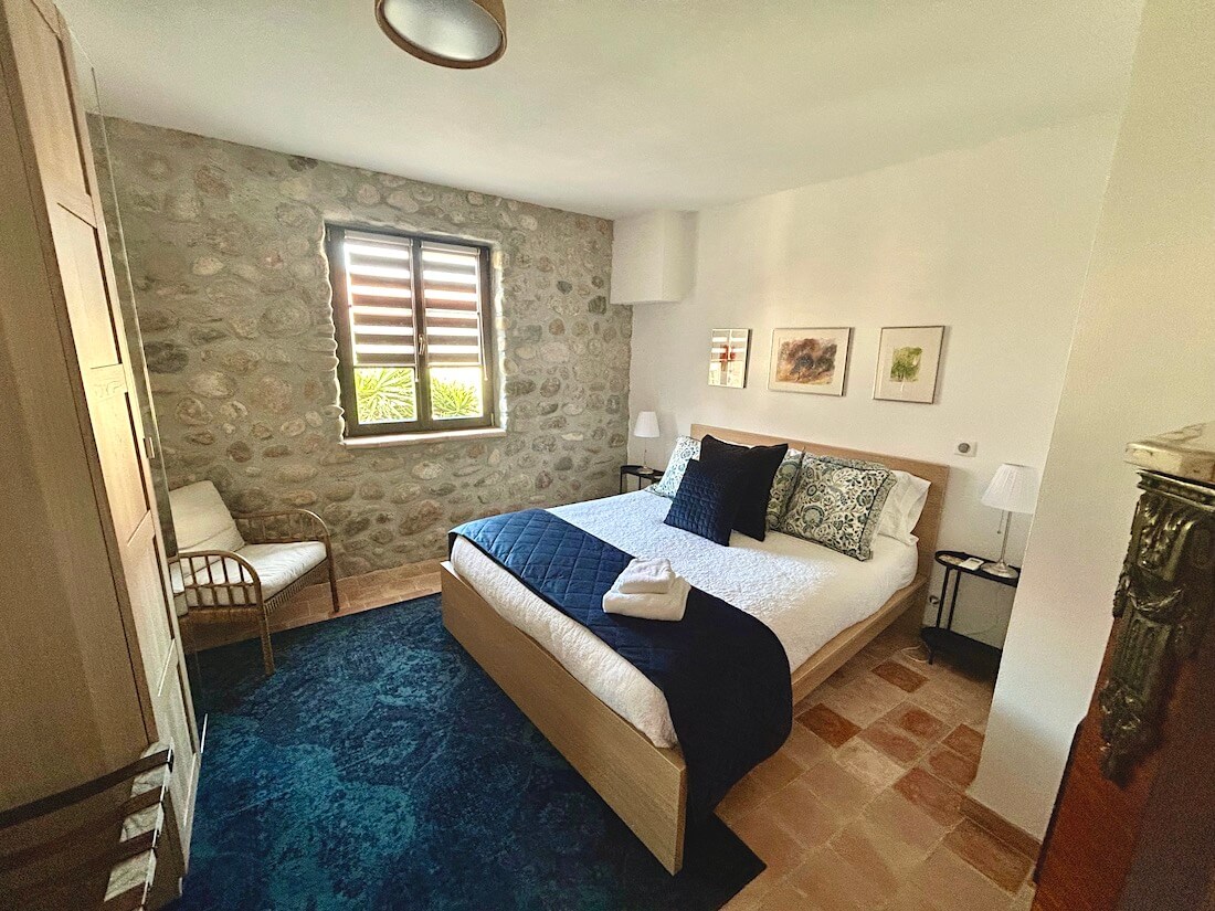 The first bedroom with an ensuite bathroom has a wonderful stone wall on the far side of the bed, the colour scheme is dark blue and white. There is one window and the bed is 160cm. There is a wardrobe, bedside tables with lamps, armchair, chest of drawers and a suitcase rack. The bathroom is in soft beiges and turquoise. It has a w.c, walk-in shower and wash hand basin. There are terracotta tiles throughout this level.