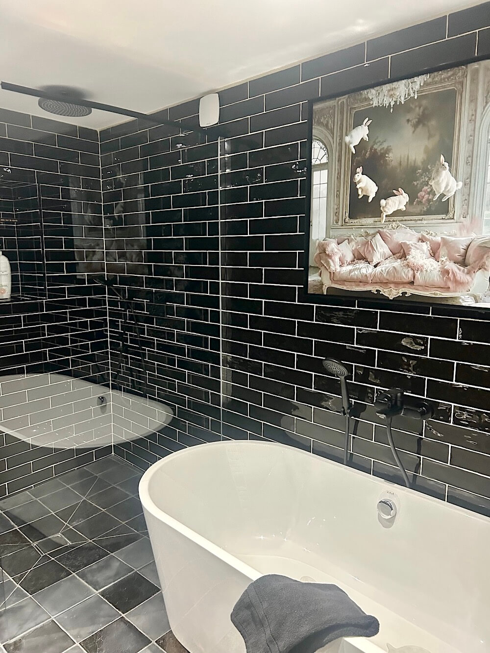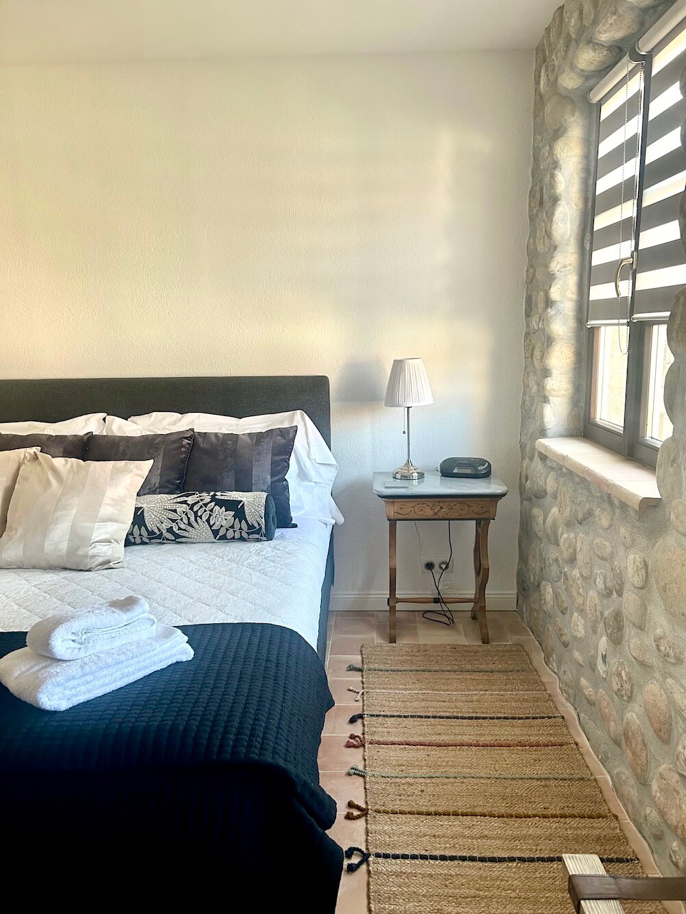The second bedroom in white, beige and black also has a stone far wall but with 2 windows, the bathroom is opposite on the other side of the corridor. The bed is 180cm. there is a wardrobe, bedside tables with lamps, full length mirror and armchair. The bathroom is large with walk-in shower and standing bathtub. There is a w.c and wash hand basin – all in a stunning black, grey and white.