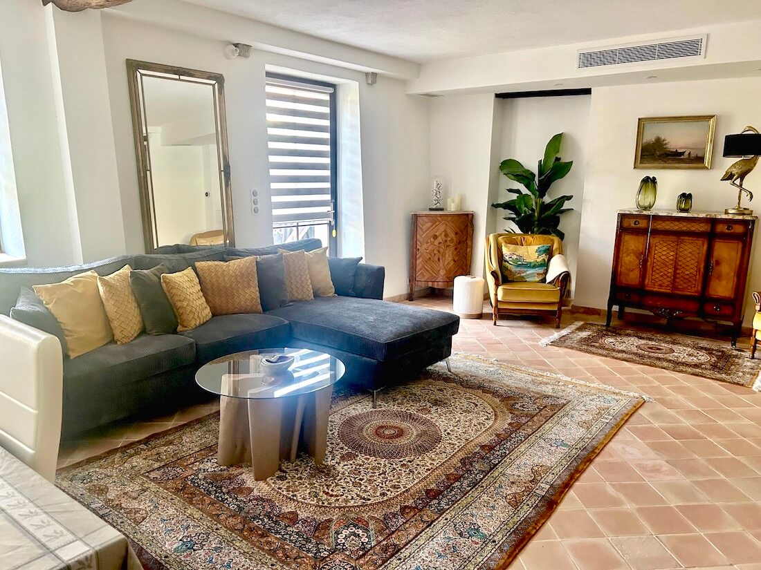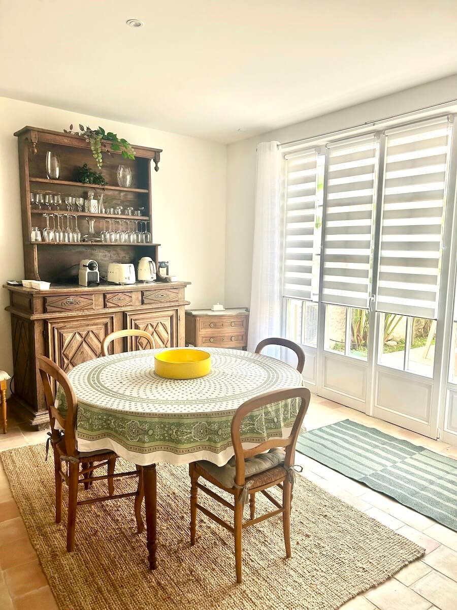 Enter directly into the sitting room area with L shaped sofa and  armchairs, a coffee table, poufs plus a huge television screen. From here there is access into the garden. Behind the sitting area is a large, contemporary, wooden dining table with 6 chairs. The kitchen is also contemporary in style in grey and beige. There is a butcher’s table adding additional space and storage plus a round, kitchen table with chairs and dresser. French doors provide another access to the garden. The oven is electric with an induction cooktop with 4 heating points. Additionally there is a microwave, fridge/freezer, Nespresso machine, French press coffee pot, teapot and dishwasher.