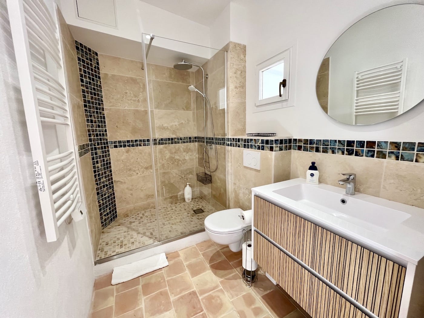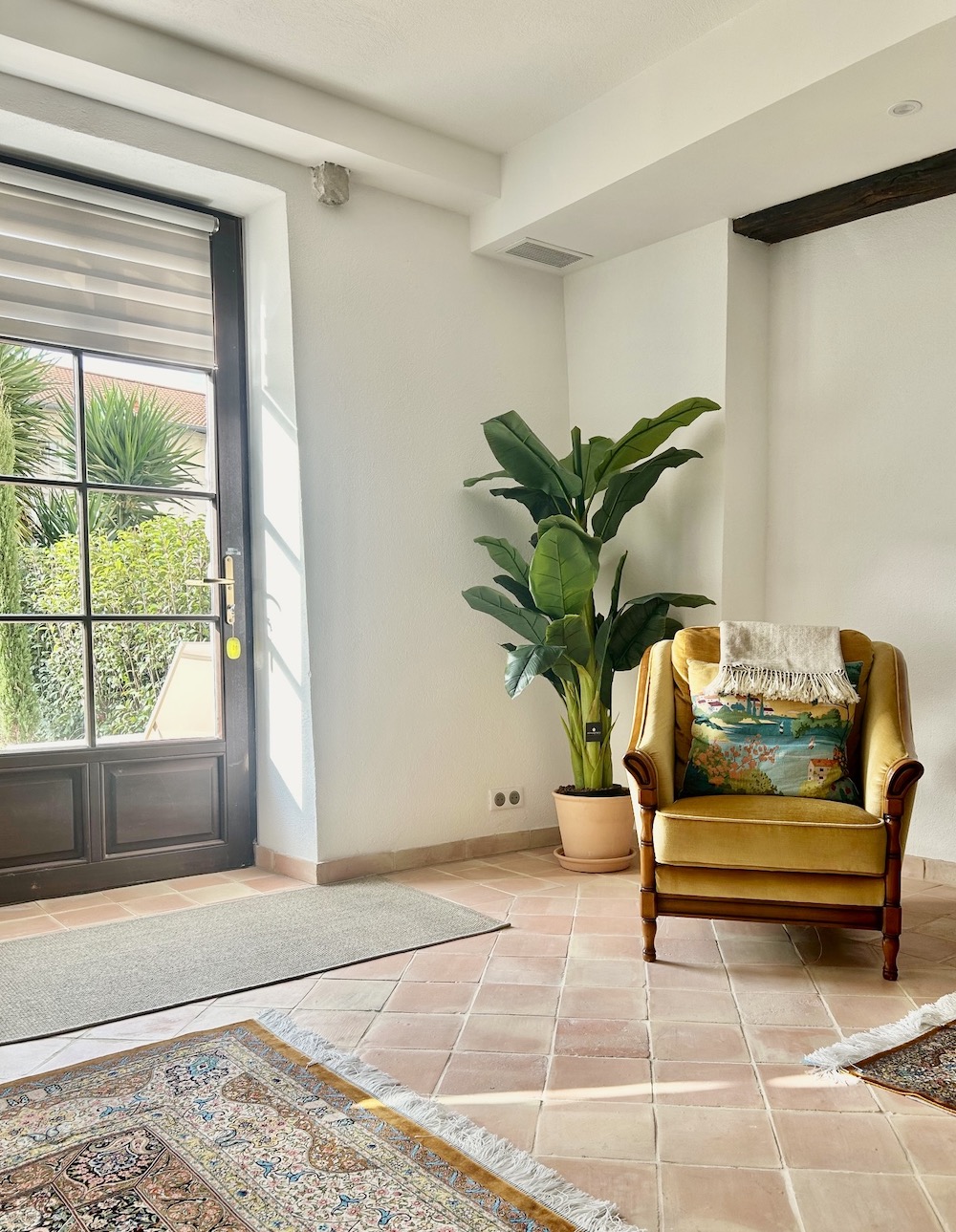 Enter directly into the sitting room area with L shaped sofa and armchairs, a coffee table, poufs plus a huge television screen. From here there is access into the garden. Behind the sitting area is a large, contemporary, wooden dining table with 6 chairs. The kitchen is also contemporary in style in grey and beige. There is a butcher’s table adding additional space and storage plus a round, kitchen table with chairs and dresser. French doors provide another access to the garden. The oven is electric with an induction cooktop with 4 heating points. Additionally there is a microwave, fridge/freezer, Nespresso machine, French press coffee pot, teapot and dishwasher.