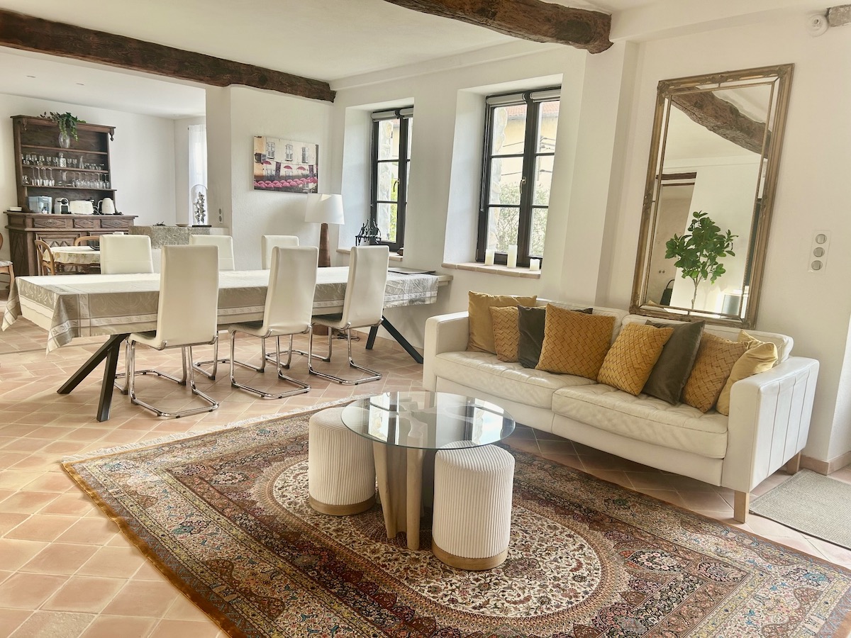Next level is the garden level. This wonderful open plan living-dining-kitchen is really bright, inviting and tastefully decorated. There are ceiling beams, terracotta flooring and air con.